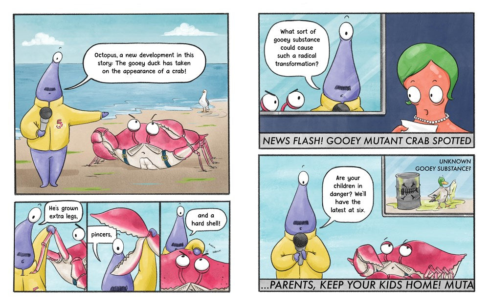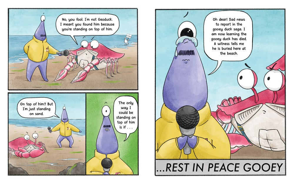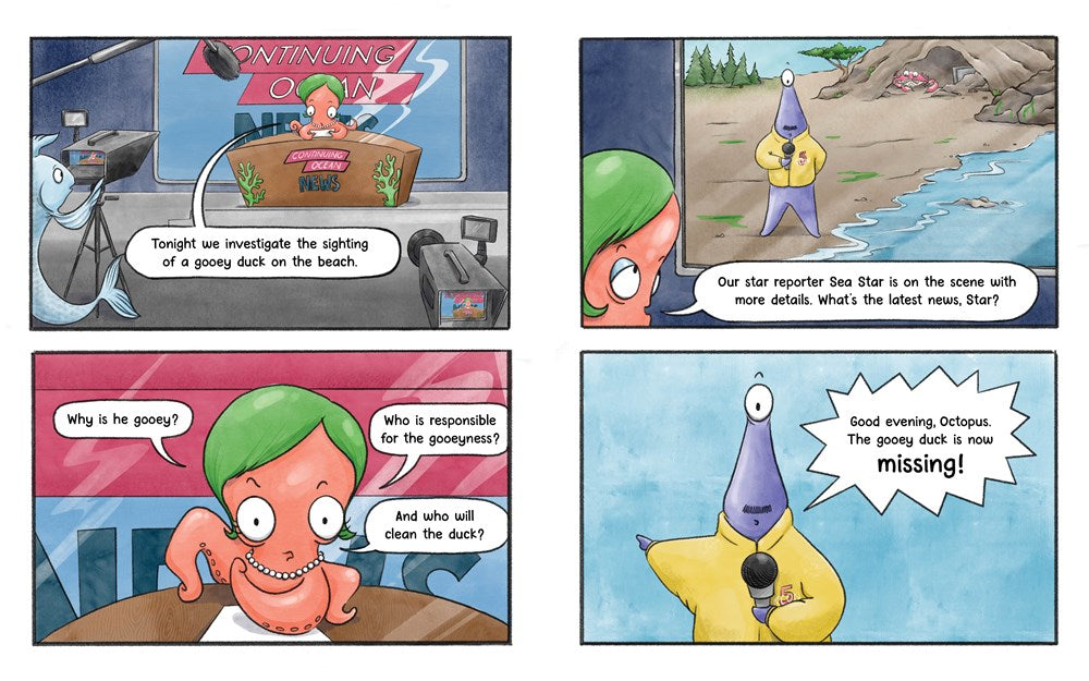 In this fun and engaging graphic novel picture book mashup, a beachside breaking news story clues the audience into a dramatic development: there’s a gooey duck on the loose!