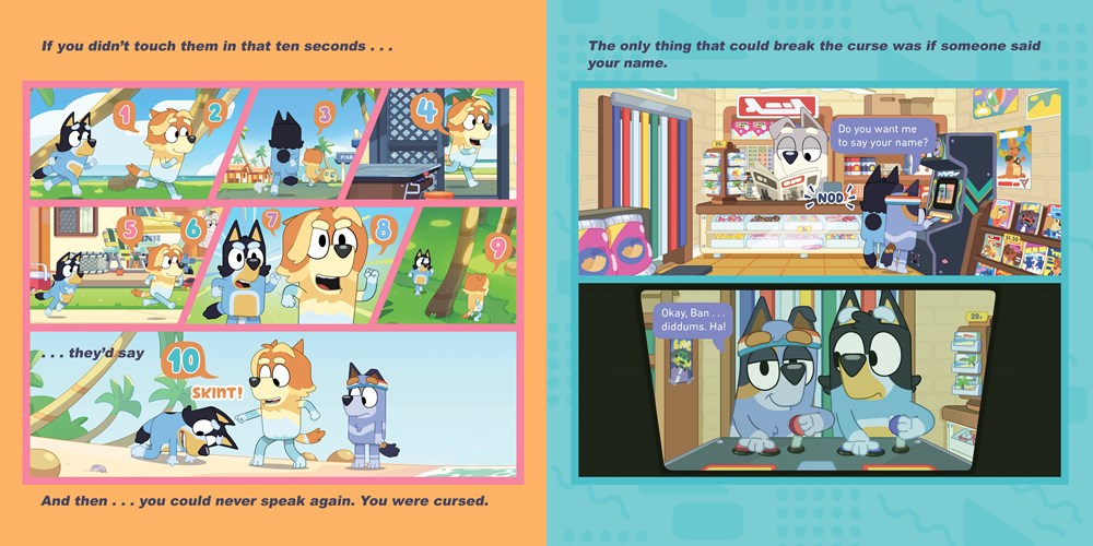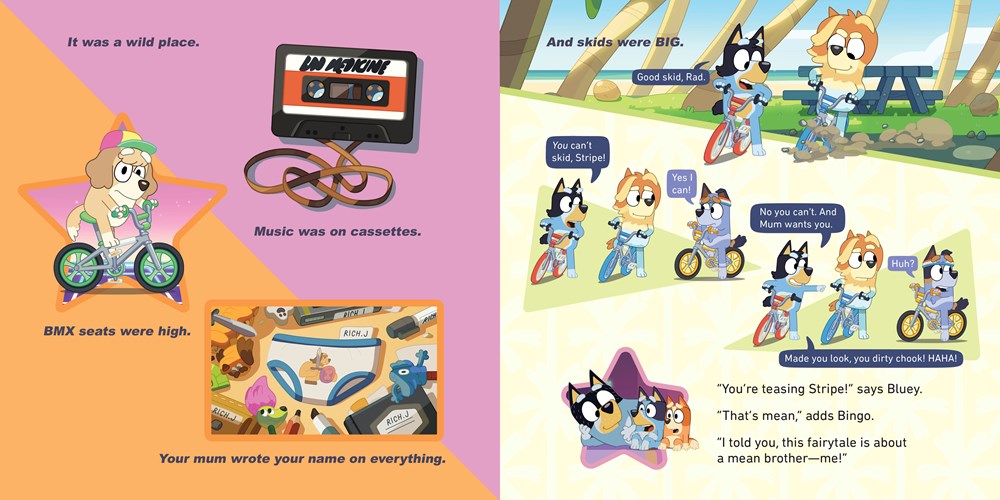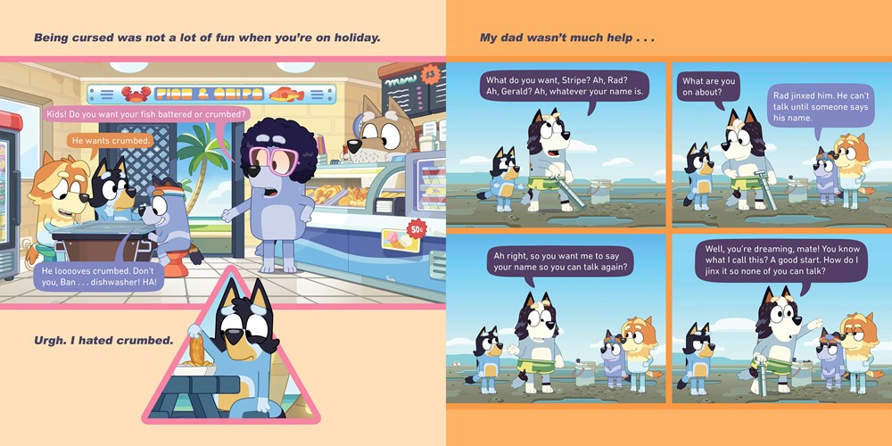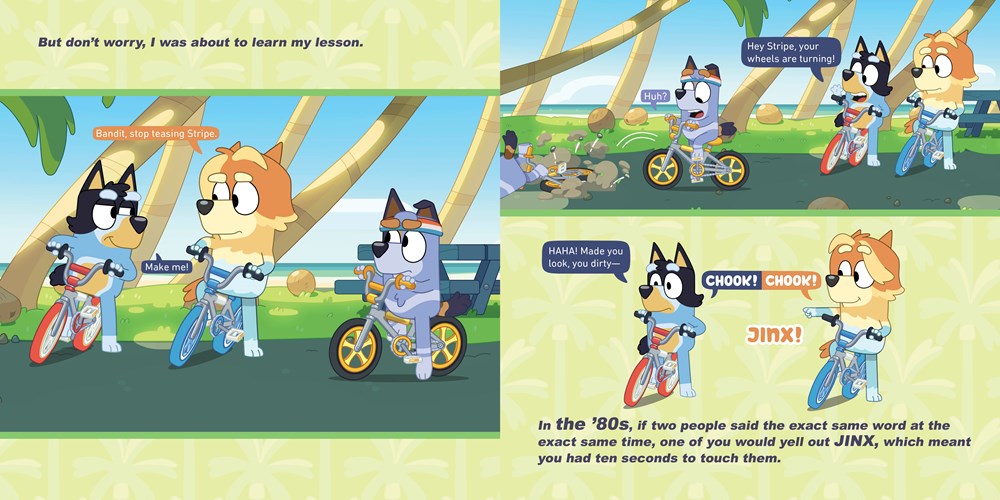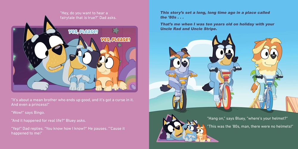 Dad tells Bluey and Bingo a story set in a wild place call the eighties. When Dad was little, he was jinxed by his older brother, Rad, after he was being mean to his younger brother, Stripe. Will Dad break his curse, or will he never speak again? Read along to find out!