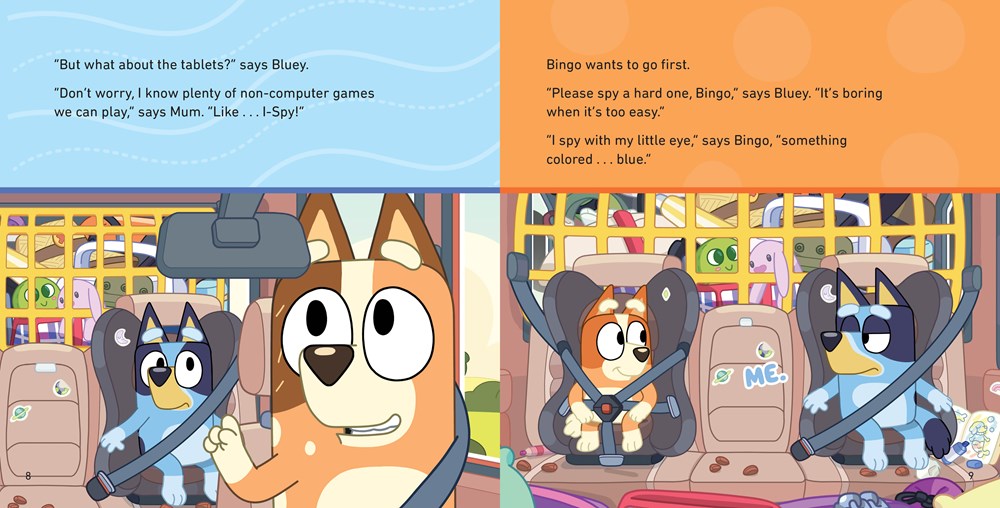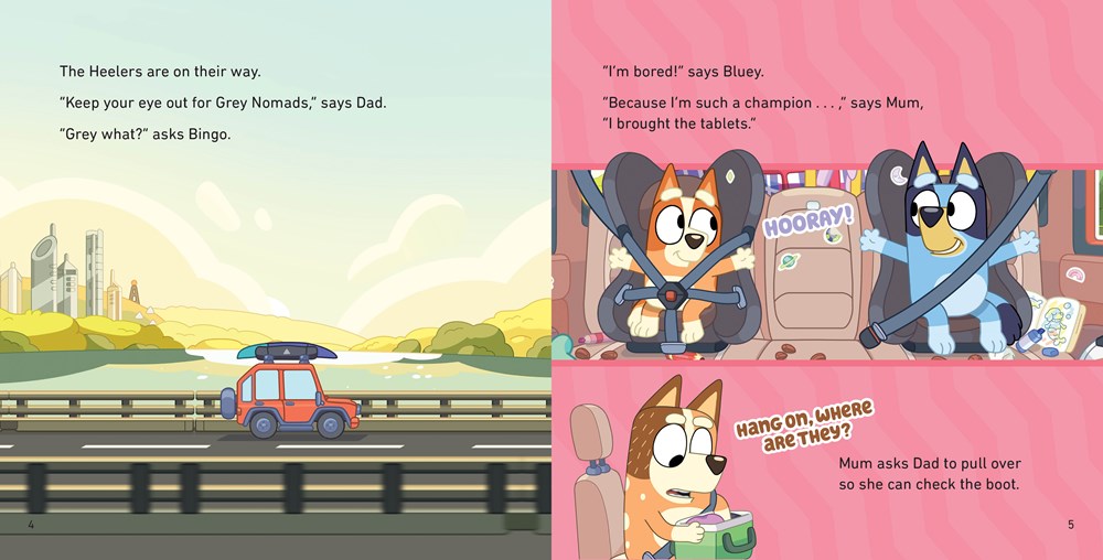 The Heeler family is going on a road trip! But Bluey and Bingo are starting to feel bored because Mum forgot their tablets. They play games like I Spy, Jumping Over Cows, and Racing a Train. But can Bluey and Bingo find other ways to have fun on their way to the camping site? Read along to find out!