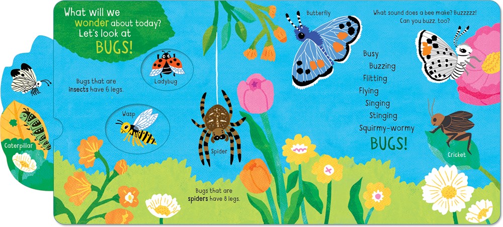 Your little one is full of wonder! Especially about bugs that are hopping, flying, squirming, and buzzing all around us! Help your baby or toddler discover and understand insects and spiders and what they do. Watch and listen but don't touch! Children who learn about nature grow up to care about nature. So go outside and learn to love butterflies and bees, spiders and worms, ants and crickets, and more. Bugs are wonderful!