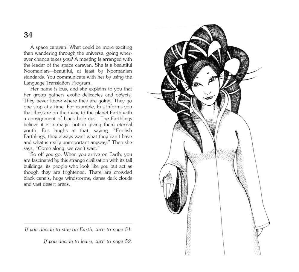 You were born on a spaceship traveling between galaxies and raised by parents from two different planets. You are now old enough to decide your citizenship: Will you choose planet Kenda or planet Croyd to be your home? Do you peacefully join a group of aliens or fight them off? How should you thwart a curse placed upon you? What do you do in the face of dinosaurs? How can you work as an agent of intergalactic peace?