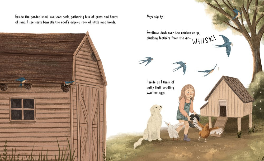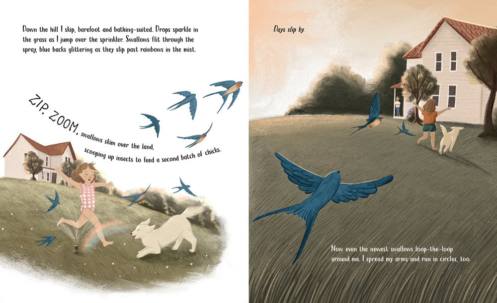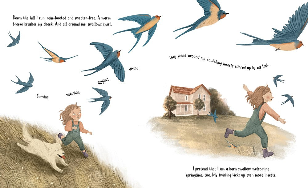 "Down the hill I run, rain-booted and sweater-free. And all around me, swallows swirl." One child's year is punctuated by the life cycle of the swallows roosting in the eaves of the shed. She watches as they build nests and teach their young to snap up bugs, zipping through the air in loop-the-loops. Winter comes and she imagines their journey south, towards warmer, longer days. And when the swallows return? She greets them open armed as friends. This is a joyful celebration of seasons and life cycles, a lyrical ode to the wonders of nature around us. Back matter includes STEM content on swallows, their life cycle, and migration paths.