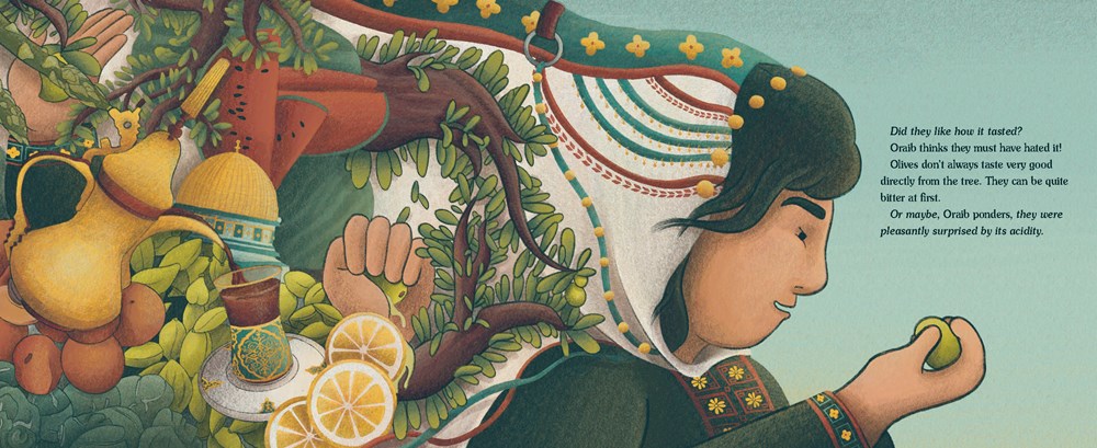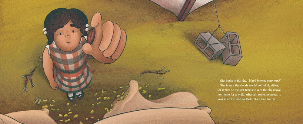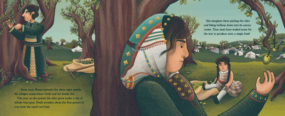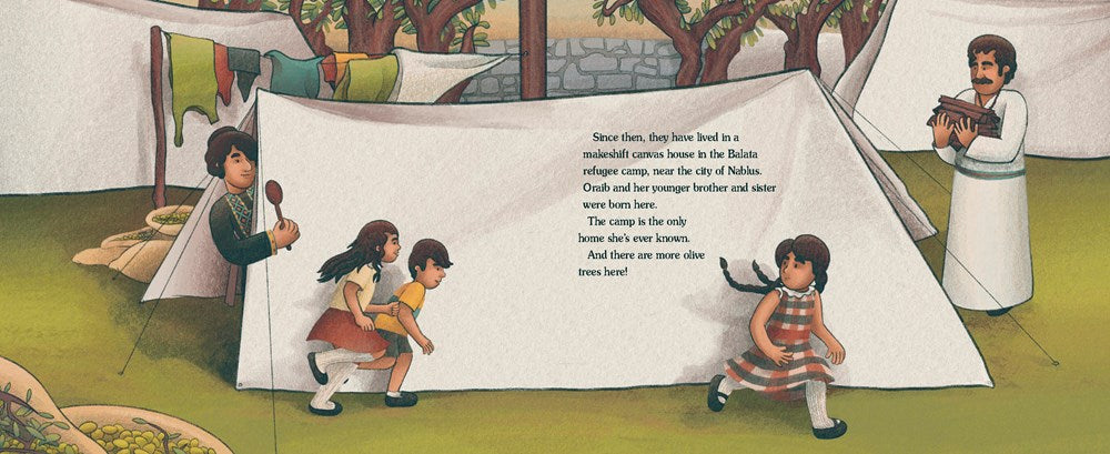Oraib loves the olive trees that grow outside the refugee camp where she lives. Each harvest, she and her mama pick the small fruits and she eagerly stomp stomp stomps on them to release their golden oil. Olives have always tied her family to the land, as Oraib learns from the stories Mama tells of a home before war.