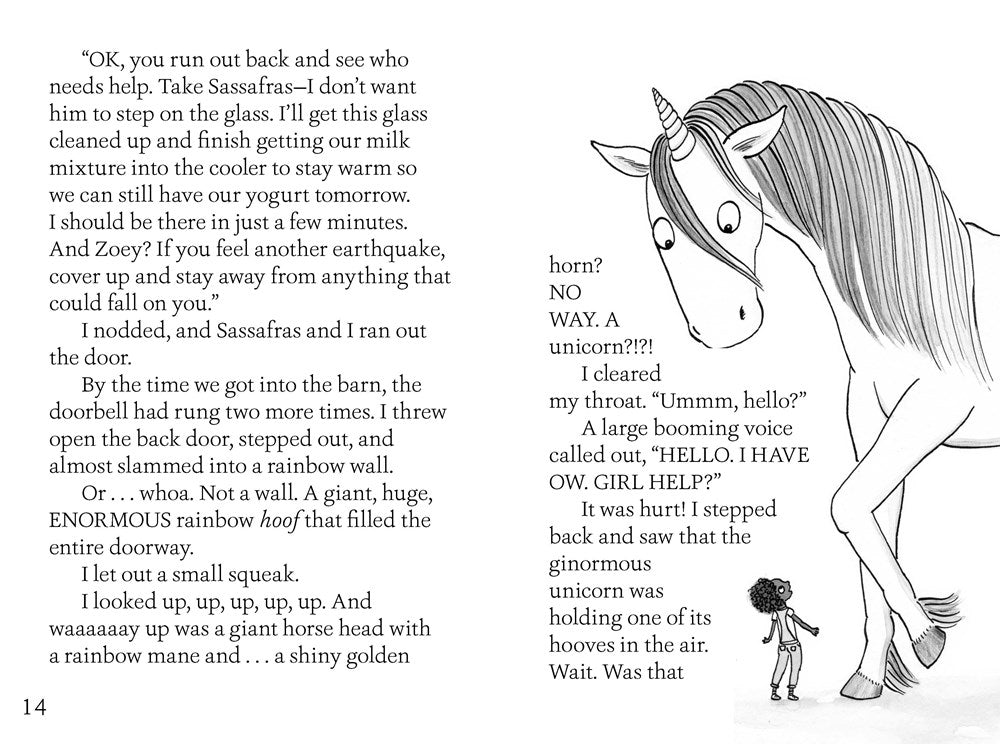 In the sixth book, an earthquake shakes Zoey's house. Or maybe it's a unicorn-quake? An enormous new friend arrives in a lot of pain, and it's getting worse every day. Zoey must work with her mom and Sassafras to find a cure -- and quickly!